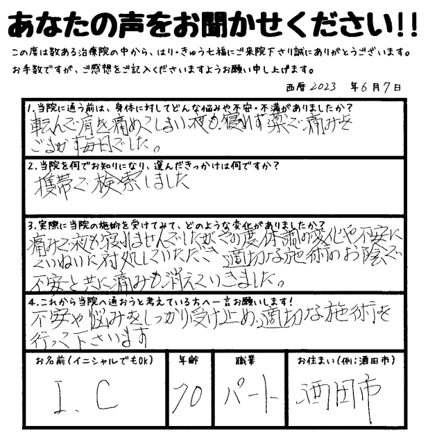 酒田市 I.C.様 70歳(職業:パート) 当院に通う前は、身体に対してどんな悩みや不安・不満がありましたか? ・転んで肩を痛めてしまい夜も寝れず薬で痛みをごまかす… -