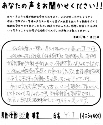 婦人科の不妊治療は、副作用の強い排卵誘発剤や注射、手術などで体調不良になりがちでしたが、七福さんの鍼灸の効果で心身ともにリラックス、血行促進効果もあり、まずまずの体調で日々過ごすことができています。