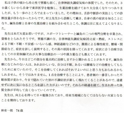 先生は、向上心を持って日々勉強されており、将来当地域にはなくてはならない大家となることを期待しております。
