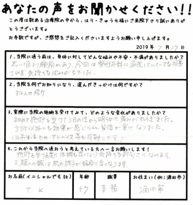 若い頃より腰痛があり、今回は整形外科に通院していてもかいぜんされず気持ちも沈みがちでした。