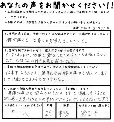 仕事中はもちろん、運転中の腰の痛みも消えて、集中して活動できるようになりました。