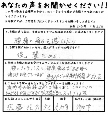 腰のメンテナンスと都度痛みがある時に施術を受けているが痛みのひどい坐骨神経痛が治った