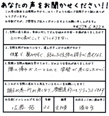腰の痛みがスーととれて、姿勢が良くなったかんじ